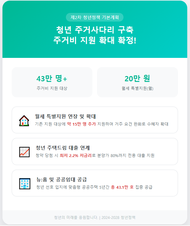 - 물량 확보: 청년층을 위한 공공분양 주택인 '뉴:홈'과 공공임대 주택을 5년간 총 43만 호 이상 공급할 계획입니다.