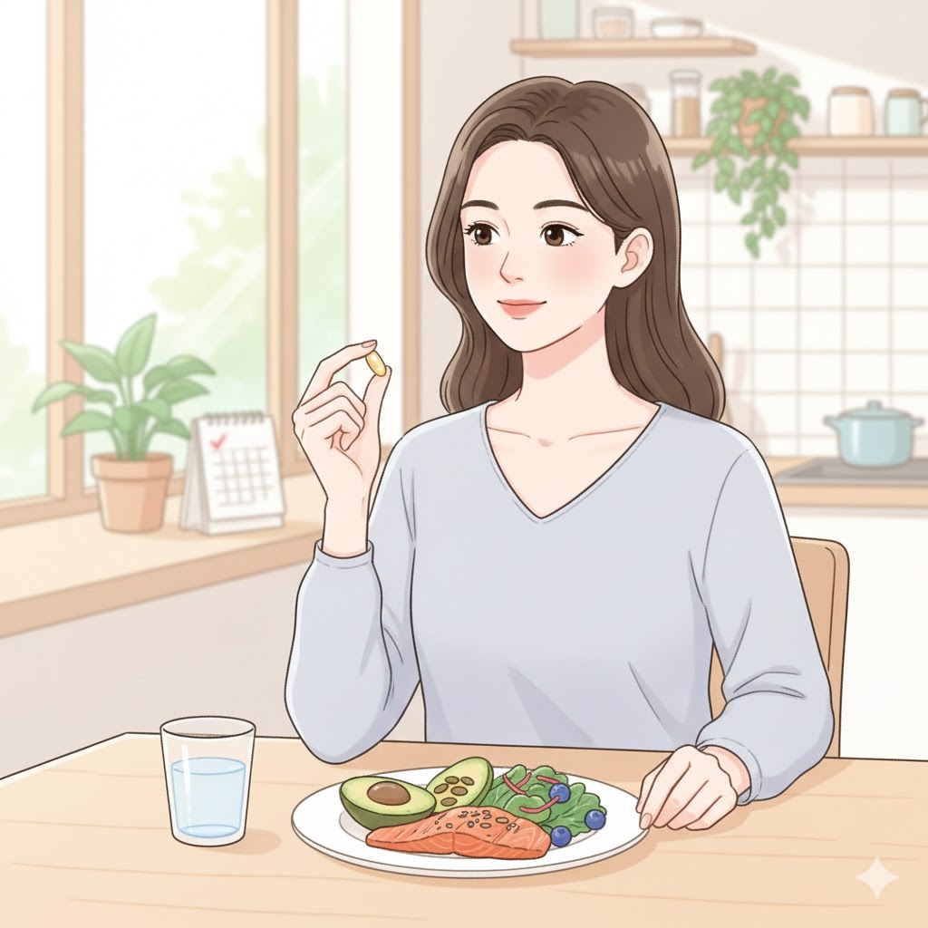 오메가3는 '언제' 먹느냐도 중요합니다. 지용성 성분이기 때문에 식사 직후나 식사 도중에 먹는 것이 흡수율을 높이는 가장 좋은 방법입니다. 간혹 생선 비린내가 올라오는 것이 걱정된다면, 향이 첨가된 제품이나 장용성 캡슐(장까지 가서 녹는 캡슐)을 선택하는 것도 지혜로운 방법입니다. 꾸준함이 정답입니다. 하루 이틀 먹고 드라마틱한 변화를 기대하기보다는, 매일 아침 혹은 저녁 루틴으로 만들어 3개월 이상 꾸준히 섭취해 보세요.