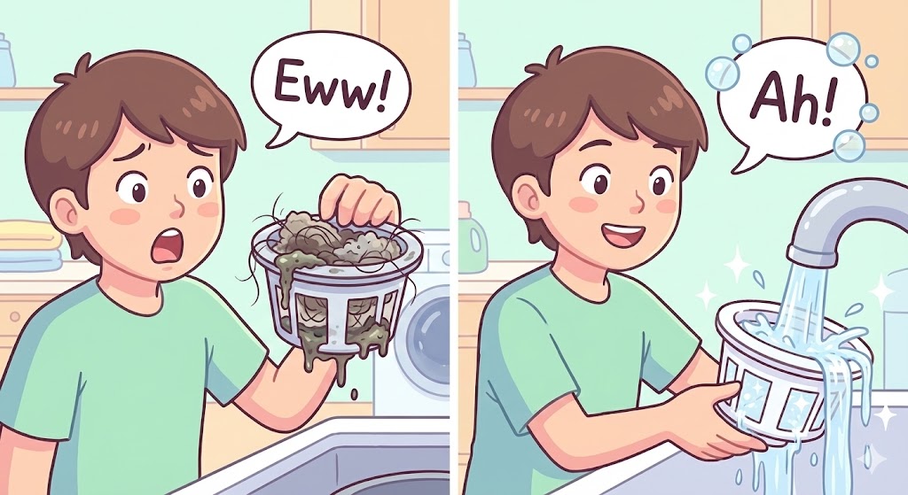드럼 세탁기 하단이나 통돌이 내부에 있는 거름망(배수 필터)도 잊지 마세요. 여기엔 옷 먼지와 머리카락이 가득하답니다. 흐르는 물에 깨끗이 씻어 햇볕에 말려주세요.