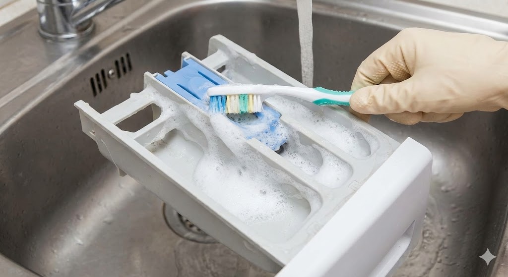 먼저 쉽게 분리할 수 있는 부품부터 씻겨줄게요. 세제 투입구는 곰팡이가 생기기 정말 쉬운 곳이에요. 'PUSH' 버튼을 눌러 쏙 뺀 다음, 칫솔로 구석구석 닦아주세요.
