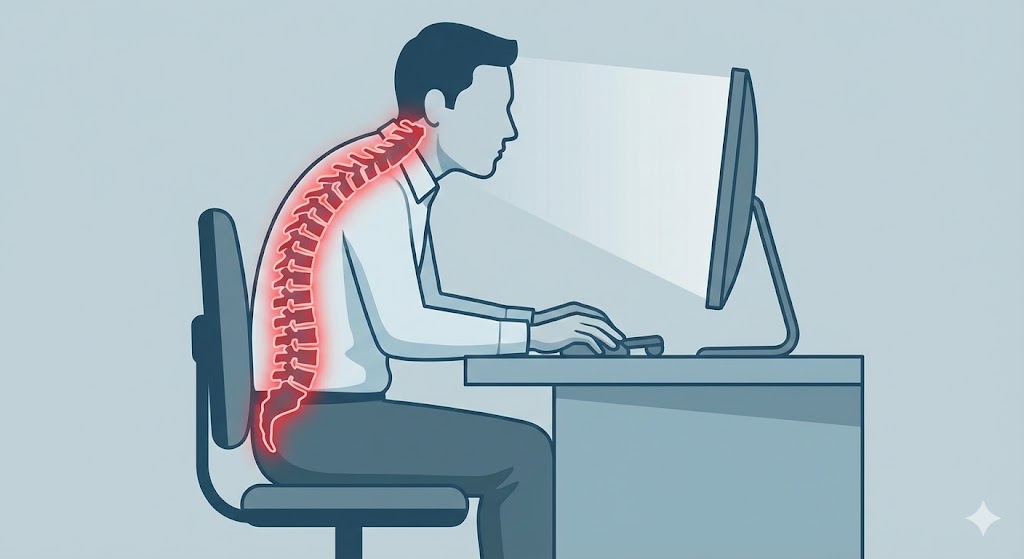 두 번째로 의심해봐야 할 범인은 바로 '자세'입니다. 지금 이 글을 보고 있는 여러분의 자세는 어떤가요? 목을 앞으로 쭉 빼고 있거나, 어깨가 잔뜩 웅크려져 있지는 않나요?