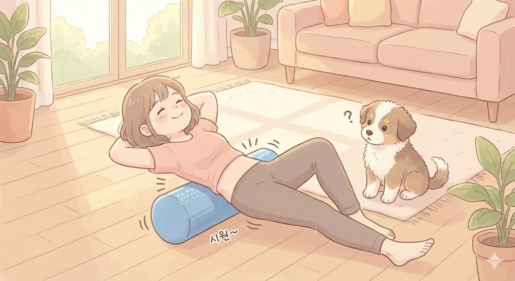 바닥이나 벽에 공을 대고, 통증이 있는 부위를 공에 밀착시킨 뒤 체중을 실어 살살 굴려주세요. "아으~ 시원해" 소리가 절로 나올 거예요. 너무 세게 하면 오히려 근육이 놀랄 수 있으니 '기분 좋은 통증'이 느껴질 정도로만 해주시는 게 좋아요. 폼롤러가 있다면 겨드랑이 림프절과 등 전체를 롤링해주어 전신의 긴장을 풀어주는 것도 추천합니다.