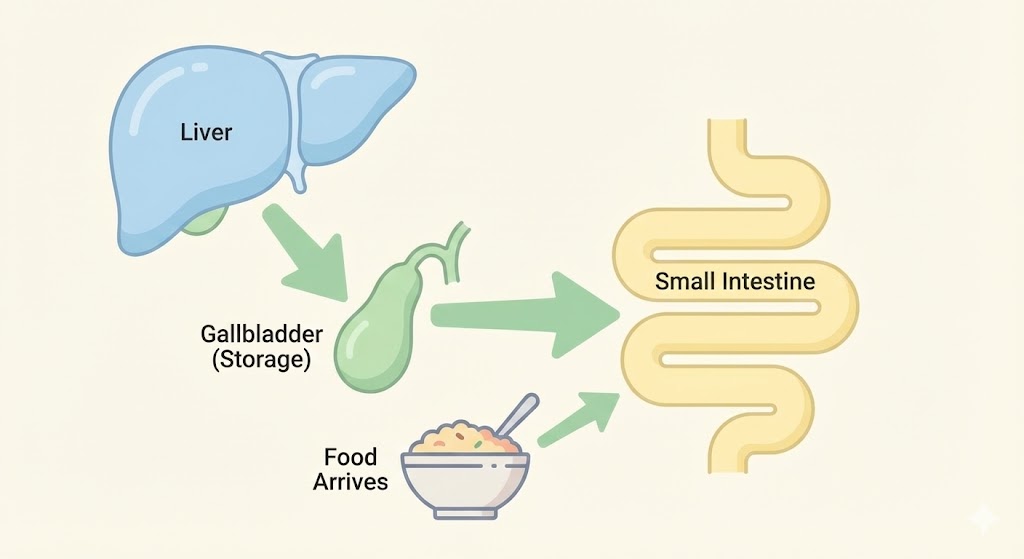 우리가 식사를 하면, 특히 지방이 섞인 음식이 십이지장으로 넘어올 때 담낭이 수축하면서 저장해 둔 진한 담즙을 쫘악 짜내어 소화를 돕습니다. 즉, 기름진 고기를 먹을 때 담낭이 아주 바쁘게 일한다고 보시면 돼요.