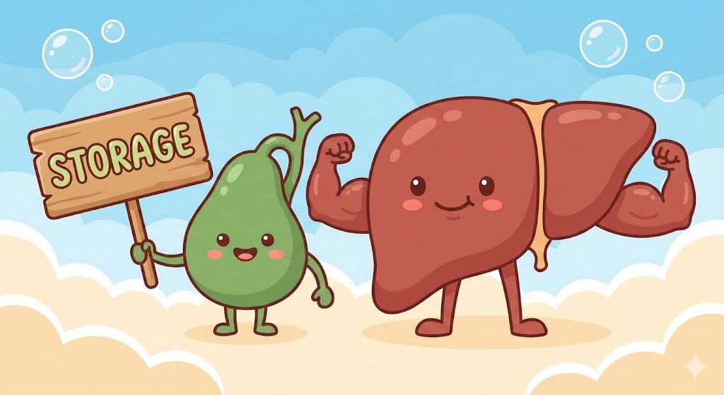 담낭은 간 바로 아래에 붙어 있는 7~10cm 정도의 작은 주머니예요. 흔히 '쓸개'라고도 부르죠. 많은 분이 담낭이 소화액(담즙)을 만든다고 생각하시지만, 사실 **담즙을 만드는 공장은 '간'**이고, 담낭은 이를 저장하고 농축하는 '창고' 역할을 해요.