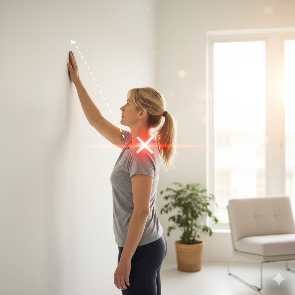 - 벽 타기 운동: 벽 앞에 서서 손가락으로 벽을 짚고 천천히 기어 올라가듯 팔을 올려주세요