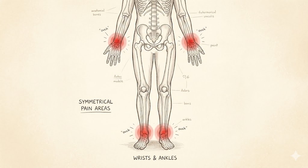 반면 류마티스 관절염은 '면역 체계의 오류'로 생깁니다. 내 몸의 면역 세포가 관절을 공격하는 자가면역 질환이에요. 손가락, 발가락 같은 작은 관절에 대칭적으로(양쪽 모두) 나타나는 경우가 많고, 전신 피로감이나 미열이 동반되기도 합니다.