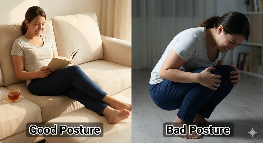 마지막으로 일상생활에서의 작은 변화가 큰 차이를 만듭니다. 한국인에게 익숙한 **좌식 생활(양반다리, 쪼그려 앉기)**은 무릎 관절에 최악의 자세입니다. 가능하면 식탁과 소파를 사용하고, 바닥에 앉아야 한다면 방석을 높게 쌓아 다리를 펴고 앉으세요.