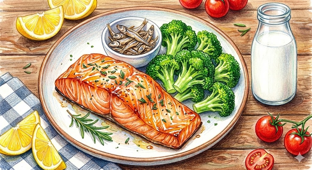 뼈와 연골 건강을 위해 **칼슘(우유, 멸치)**과 비타민D를 충분히 섭취하세요. 또한 등 푸른 생선(고등어, 연어)에 풍부한 오메가-3는 염증을 억제하는 효과가 탁월합니다. 브로콜리나 시금치 같은 녹색 잎채소도 항산화 성분이 풍부해 관절 노화를 막아줍니다.
