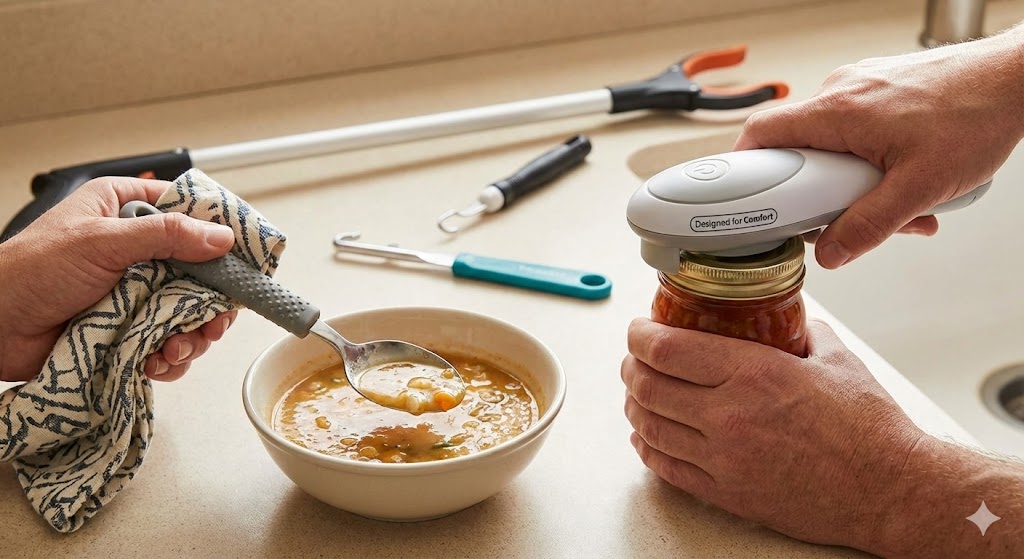 손가락이나 손목에 힘을 주기 어렵다면, 억지로 힘을 쓰기보다 보조 도구를 활용하세요. 병따개, 긴 구둣주걱, 두꺼운 손잡이의 펜 등을 사용하면 관절에 가는 불필요한 스트레스를 줄일 수 있습니다.
