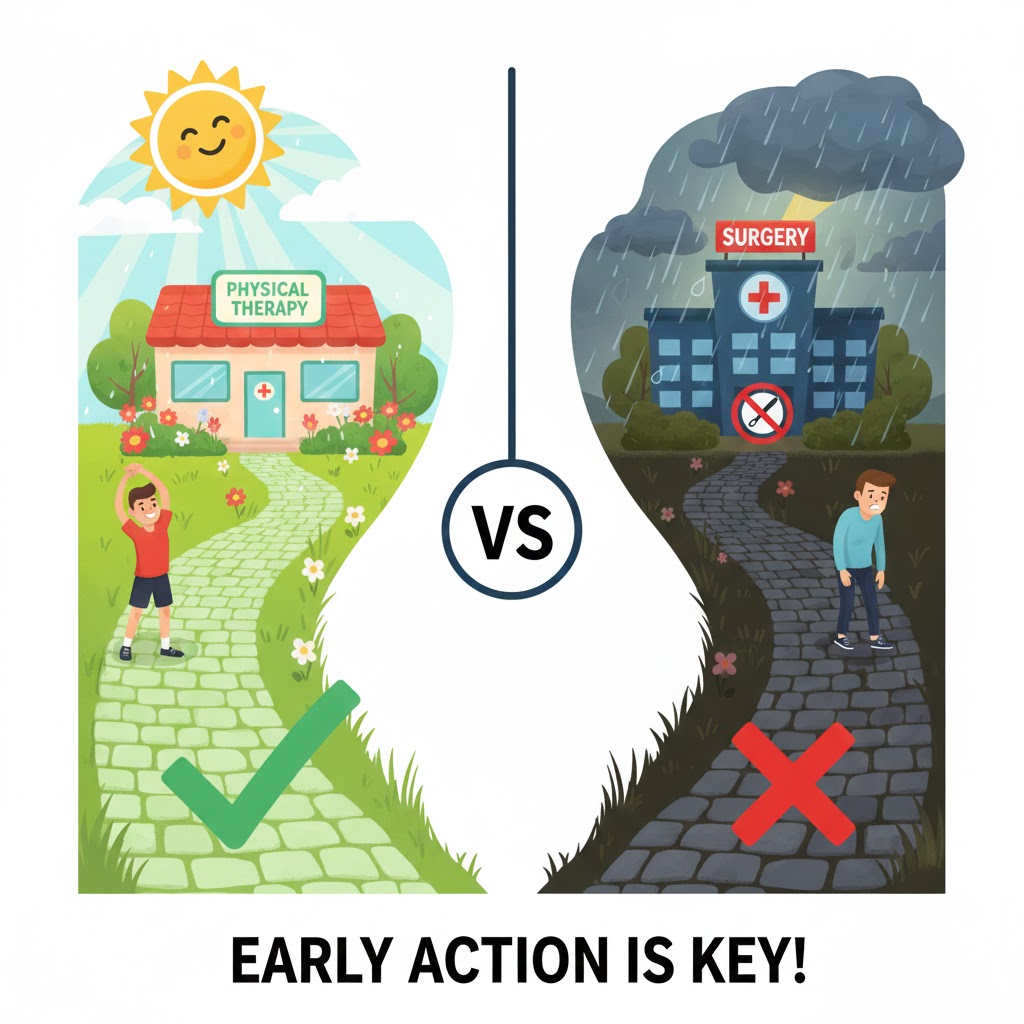 목디스크는 진행성 질환이에요. 초기에는 약물 치료나 물리 치료, 도수 치료 같은 보존적 치료만으로도 충분히 좋아질 수 있어요. 하지만 "시간 지나면 낫겠지" 하고 방치하다가 마비 증세까지 오면 수술이 불가피할 수도 있답니다.