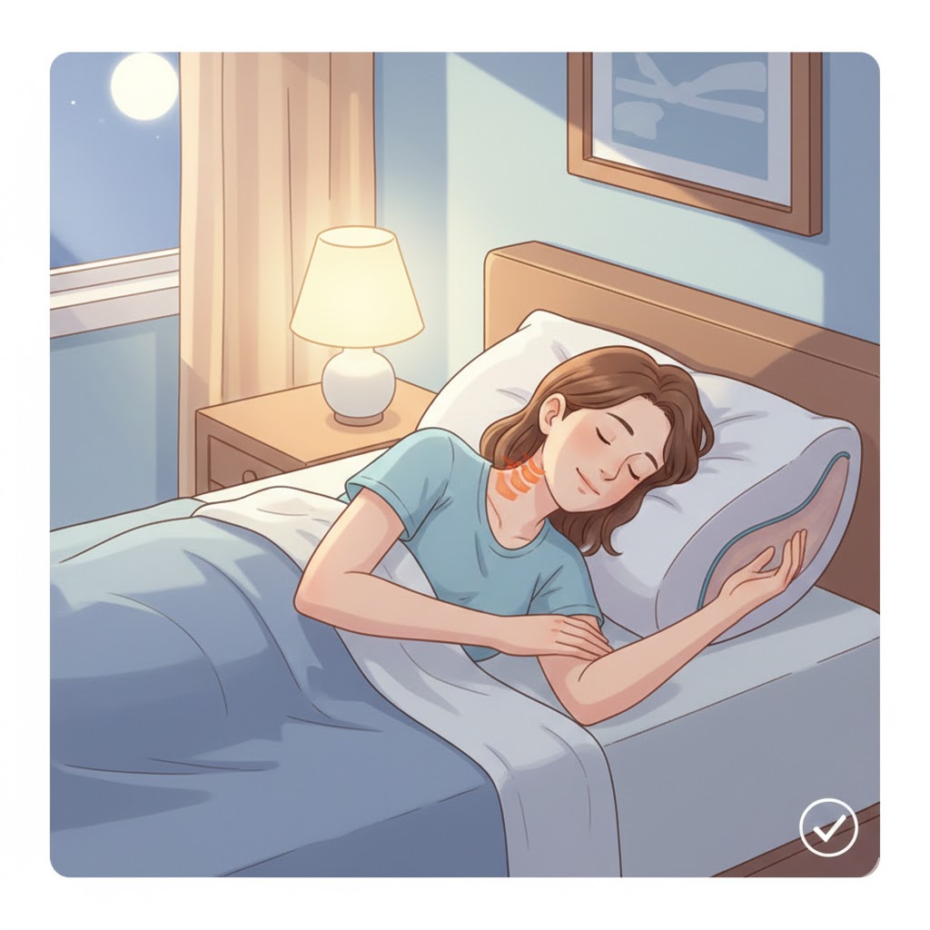 잠잘 때 베개 높이도 체크해보세요. 너무 높은 베개는 목 뼈의 C자 커브를 무너뜨려요. 목 뒤를 부드럽게 받쳐주는 적당한 높이의 베개를 사용하는 것이 좋습니다.