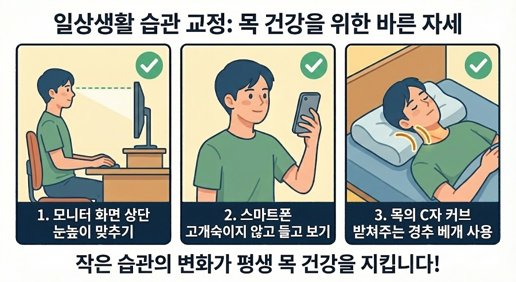 가장 중요한 것은 모니터와 스마트폰의 높이입니다. 화면 상단이 눈높이와 맞도록 조절하여 고개가 숙여지지 않게 해주세요. 또한, 잠잘 때 너무 높거나 낮은 베개는 피하고, 목의 C자 커브를 받쳐줄 수 있는 적절한 높이의 경추 베개를 사용하는 것이 좋습니다.
