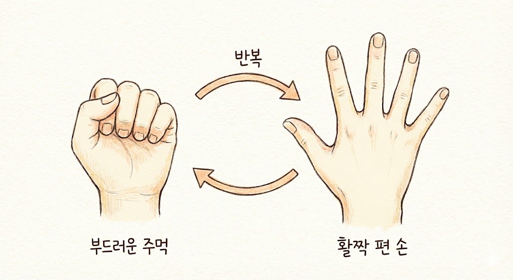 1. 부드러운 주먹 쥐기: 엄지손가락을 밖으로 내놓고 부드럽게 주먹을 쥐었다가, 손가락을 최대한 넓게 쫙 펴주세요. 이 동작을 천천히 10회 반복합니다.