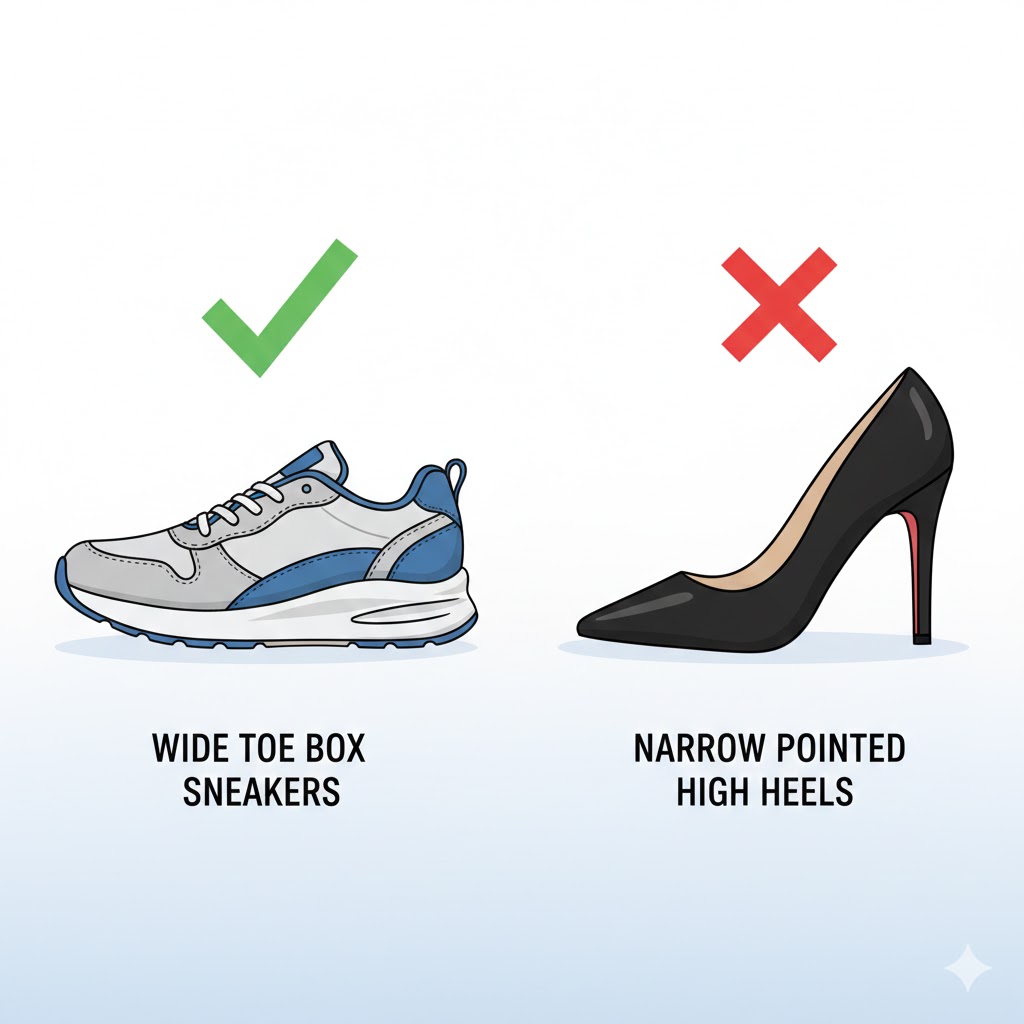 가장 기본적이면서도 강력한 해결책은 '신발 바꾸기'입니다. 아무리 좋은 치료를 받아도 원인이 되는 신발을 계속 신는다면 도루묵이겠죠? 발가락이 꽉 끼지 않고 자유롭게 움직일 수 있는, 앞코가 넓은(Wide toe box) 신발을 선택해야 합니다.