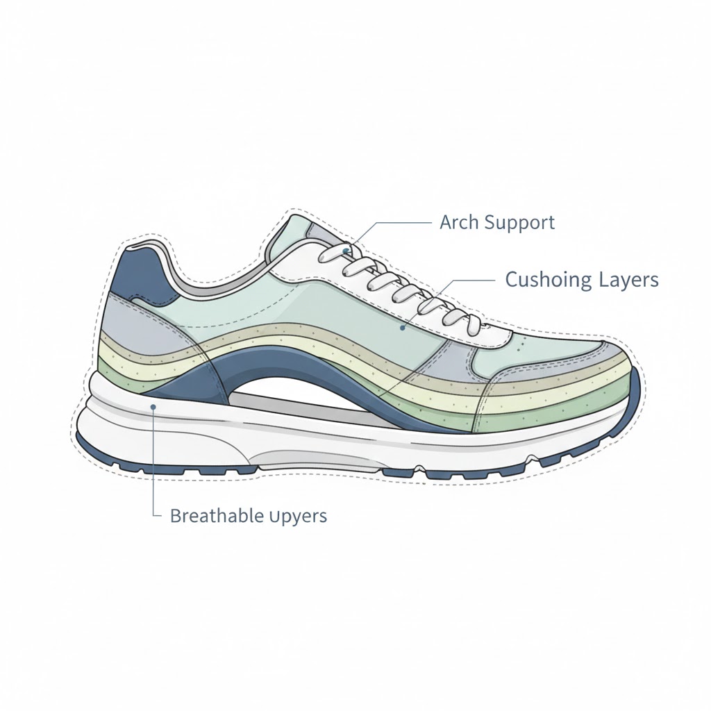 굽은 2~3cm 정도로 낮고, 발바닥의 아치를 잘 받쳐주는 기능성 깔창이 있는 것이 좋습니다. 만약 직업 특성상 구두를 신어야 한다면, 출퇴근 시간만이라도 편한 운동화로 갈아 신거나 사무실에서는 슬리퍼를 착용해 발의 피로를 수시로 풀어주는 것이 중요합니다.