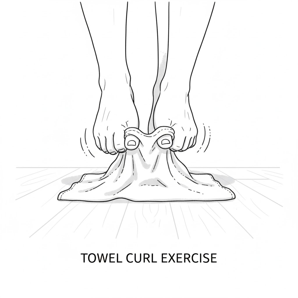 가장 쉬운 운동은 '발가락으로 수건 집기'입니다. 바닥에 수건을 깔고 발가락 힘만으로 수건을 집어 올리는 동작을 반복해보세요. 또, '발가락 가위바위보'도 좋습니다. 엄지발가락만 따로 움직이는 연습을 통해 굳어진 관절을 유연하게 만들 수 있습니다.