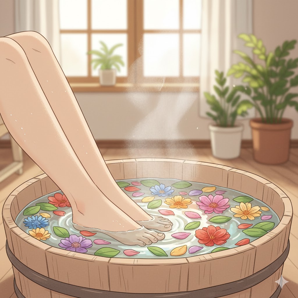 하루 종일 혹사당한 발에게 휴식을 선물하세요. 족욕은 발의 혈액순환을 돕고 긴장된 근육을 이완시키는 최고의 방법입니다. 따뜻한 물에 10~15분 정도 발을 담그고 있으면 하루의 피로가 싹 풀리는 기분이 들 거예요.