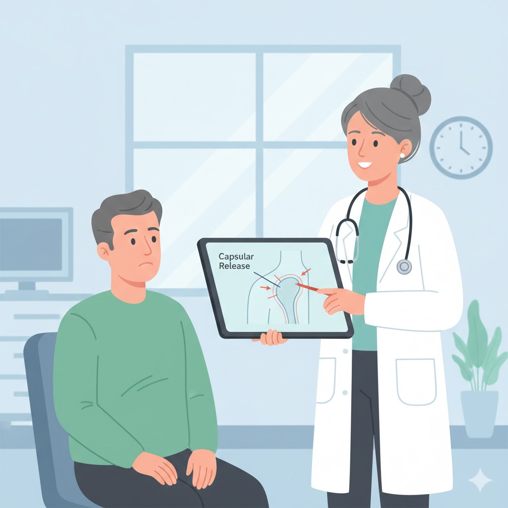 주로 '관절경하 관절낭 유리술'을 시행하는데요, 내시경을 통해 쪼그라든 관절낭을 절개하여 어깨를 펴주는 수술입니다. 수술 후에도 재활 운동은 필수라는 점, 꼭 기억해 주세요!