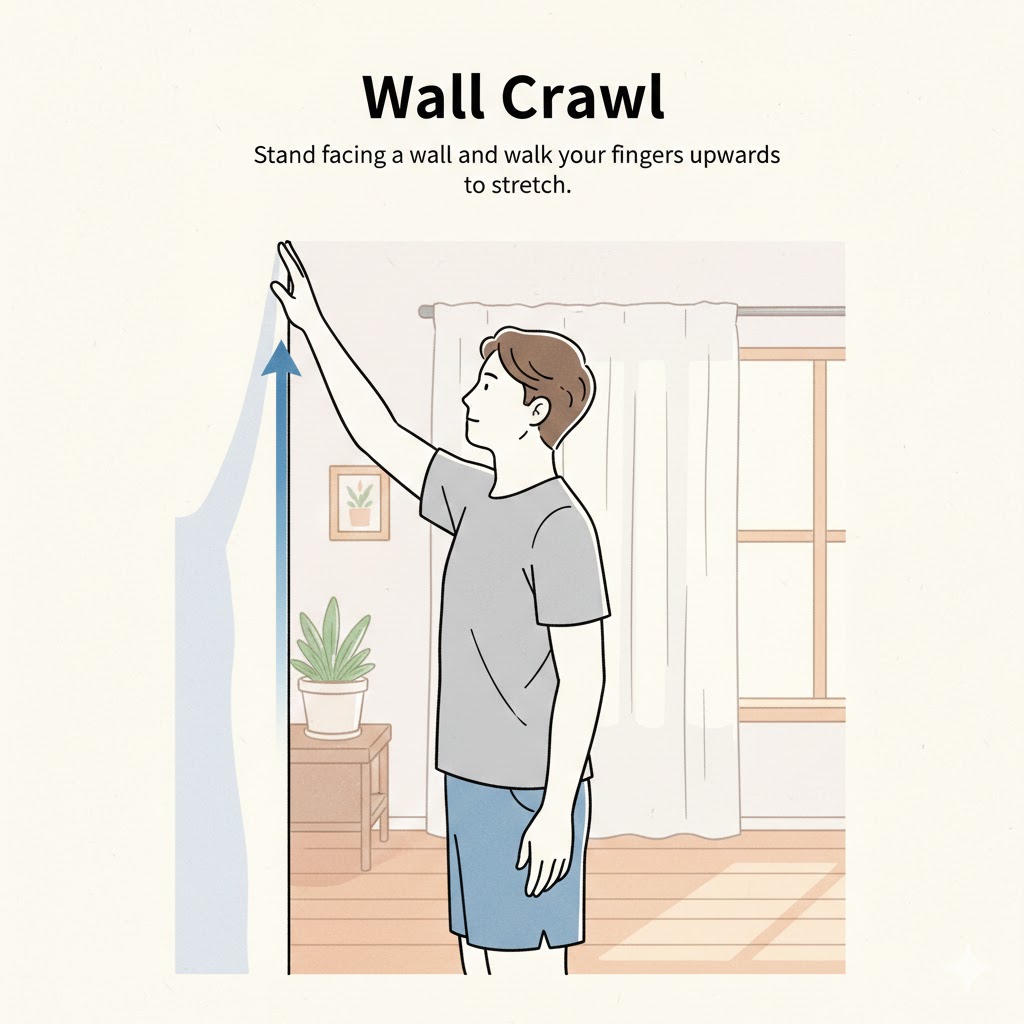 3. 벽 타기 운동 벽 앞에 서서 손가락으로 벽을 타고 조금씩 위로 올라가는 동작입니다. 겨드랑이가 늘어나는 느낌을 받으며 매일 조금씩 더 높이 올라가는 것을 목표로 해보세요.