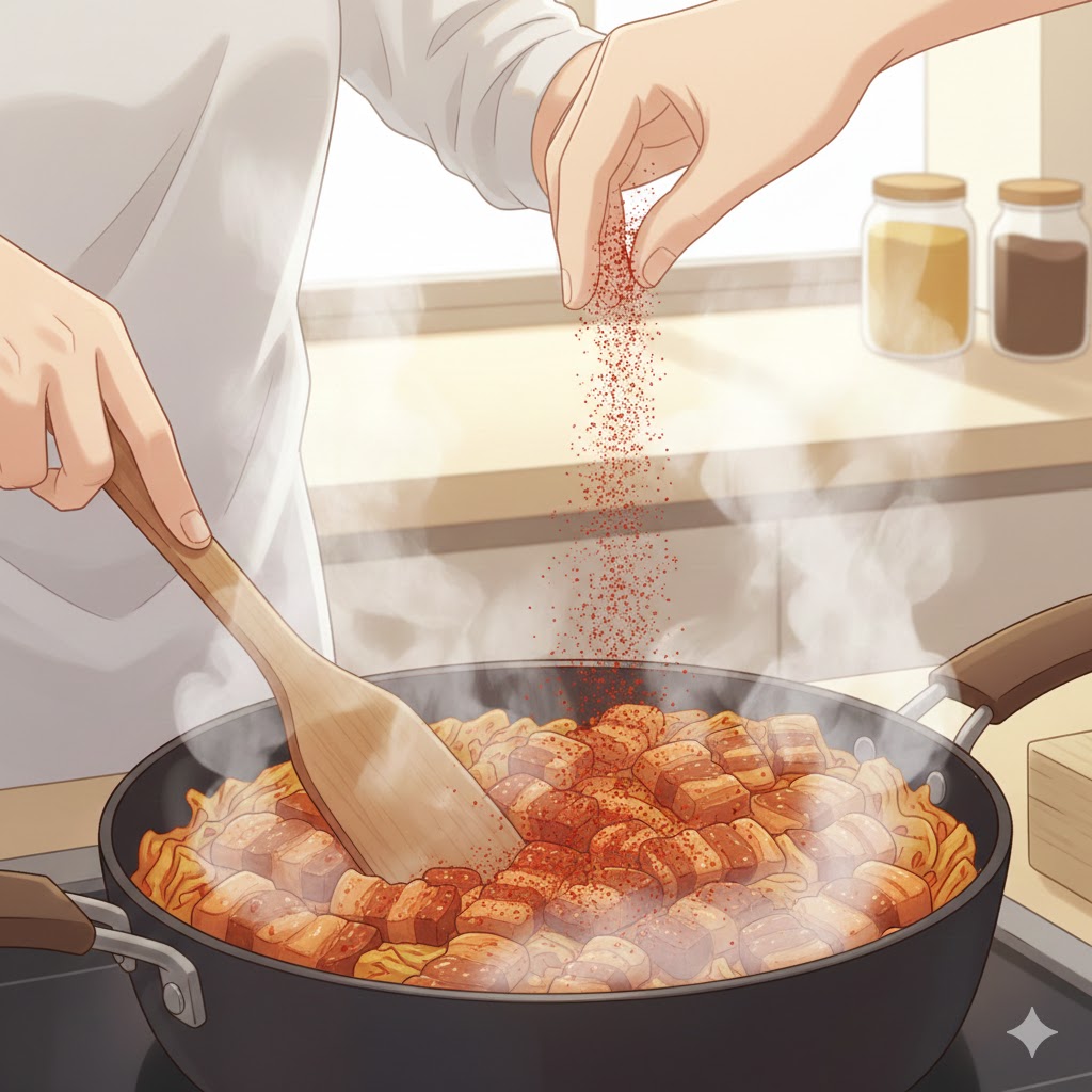 이때 고춧가루를 반 스푼 정도 넣어주면 고추기름이 살짝 배어 나오며 색감이 훨씬 예뻐지고 칼칼한 맛이 더해집니다.