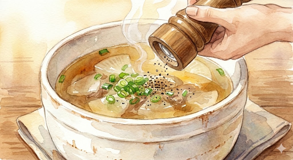 취향에 따라 후춧가루를 톡톡 뿌려주면 칼칼하고 개운한 맛이 더해지죠.