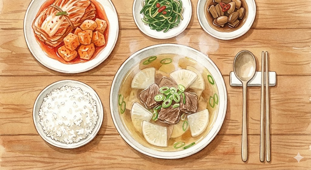 소고기 양지는 찬물에 핏물을 빼고, 참기름에 무와 함께 충분히 볶아주세요. 물을 붓고 끓으면 거품을 걷어낸 뒤 국간장, 액젓, 소금으로 간을 합니다. 액젓 한 스푼이 감칠맛의 비결! 마지막에 파를 넣고 한소끔 끓이면 완성입니다.
