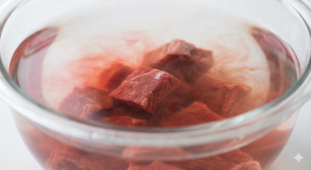 찬물에 약 20분에서 30분 정도 담가두세요. 설탕을 아주 조금(반 스푼 정도) 넣으면 삼투압 현상으로 핏물이 더 빨리 빠진답니다. 시간이 없다면 키친타월로 꾹꾹 눌러 핏기를 닦아내는 것도 방법이에요.