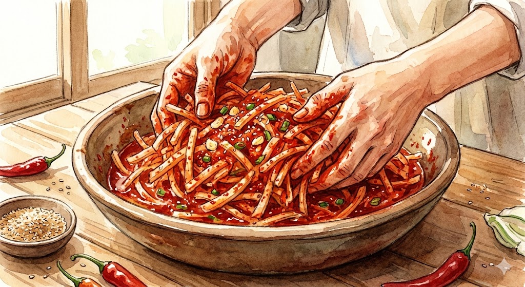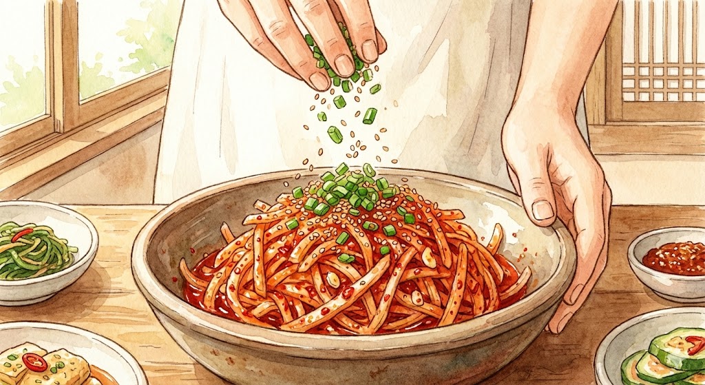 혹시 집에서 무생채를 만들고 나서 "어? 왜 내가 만든 건 물이 흥건하지?" 혹은 "가게에서 먹던 그 감칠맛이 안 나네?" 하고 실망하신 적 있으신가요? 분명 같은 재료를 썼는데 맛이 밍밍하거나, 하루만 지나도 식감이 눅눅해져서 속상했던 경험, 누구나 한 번쯤은 있을 거예요
