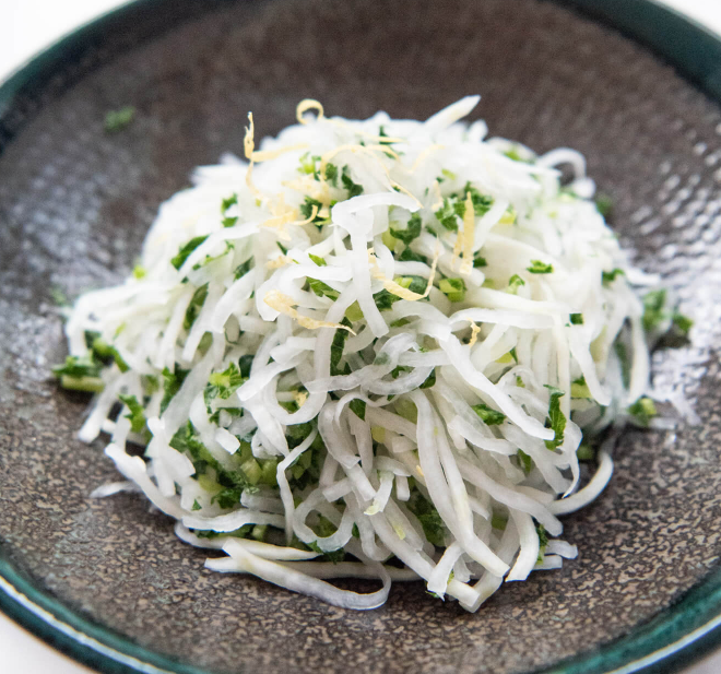 무생채처럼 생으로 먹는 요리에는 반드시 초록색 부분이 많은 무를 선택하시거나, 무의 윗부분을 사용해 주세요. 이것만 지켜도 설탕을 덜 쓰고 천연의 단맛을 끌어올릴 수 있답니다.