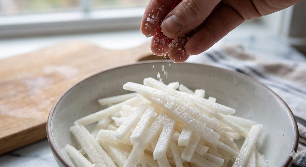 삼투압 현상으로 무의 수분이 빠져나오면서 식감은 꼬들꼬들해지고, 나중에 양념을 했을 때 물이 생겨 싱거워지는 것을 방지할 수 있습니다. 절인 후 나온 물은 꽉 짜지 말고, 채반에 받쳐 자연스럽게 물기만 빼주세요. 그래야 무의 맛있는 즙까지 다 버리지 않게 됩니다.