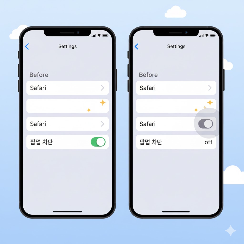 - 아이폰 사파리: 아이폰 기기 설정 > Safari > 팝업 차단 스위치 끄기(OFF). 평소엔 보안을 위해 차단해 두고, 필요할 때만 푸는 것을 추천해요!