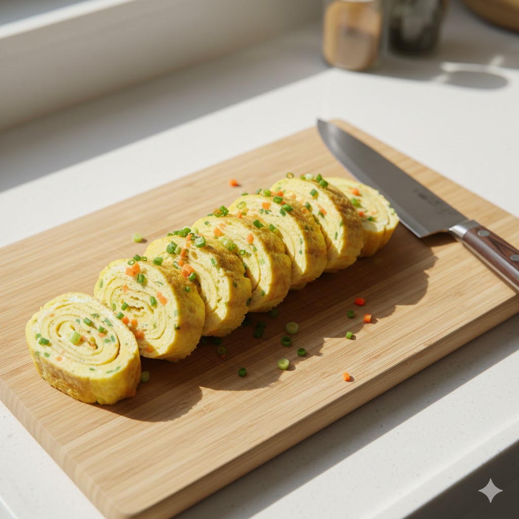 완성된 계란말이는 한 김 식힌 후에 썰어야 합니다. 뜨거울 때 썰면 모양이 흐트러지고 부서지기 쉬워요. 조금만 참았다가 썰면 단면이 훨씬 깔끔하고 예쁘게 나온답니다.