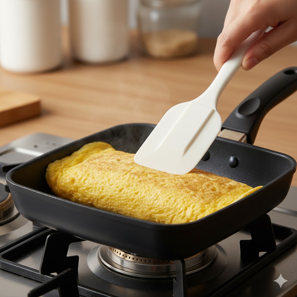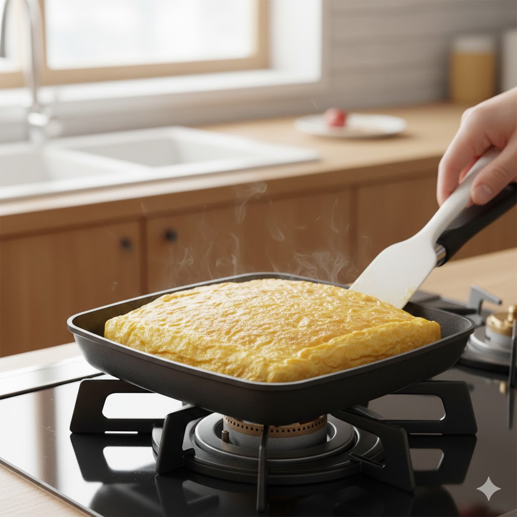계란말이를 할 때 둥근 팬을 써도 되지만, 초보자라면 사각 팬을 강력 추천합니다. 모양 잡기가 훨씬 수월하고 양옆을 눌러주기 좋아 완성도가 높아져요.
