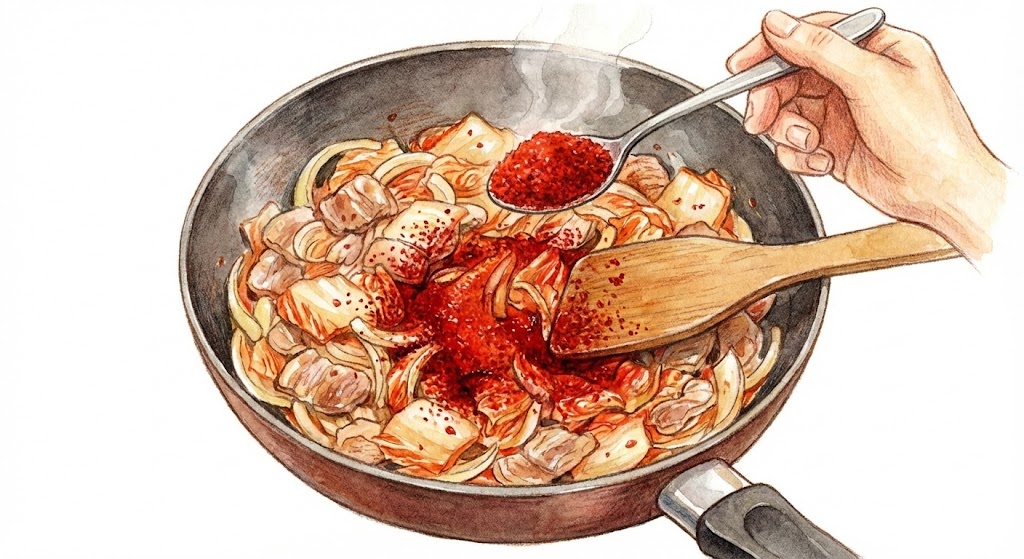 김치 국물을 너무 많이 넣으면 밥이 질어질 수 있어요. 대신 고춧가루를 한 스푼 넣어보세요. 고춧가루가 수분을 잡아주면서 볶음밥의 색깔을 더욱 먹음직스러운 붉은색으로 만들어줍니다. 매콤한 맛을 선호하신다면 고운 고춧가루를 추천드려요.