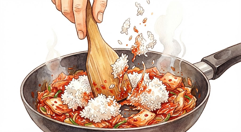 이제 준비해둔 밥을 넣습니다. 이때는 불을 잠시 끄거나 아주 약하게 줄여주세요. 밥과 양념이 고루 섞이지 않은 상태에서 센 불로 볶으면 양념만 타버릴 수 있거든요.