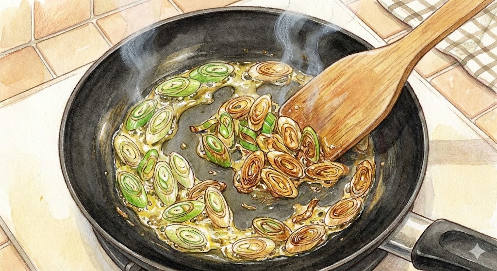 많은 분이 김치를 먼저 볶지만, 진짜 고수들은 **'파기름'**부터 냅니다. 달궈진 팬에 식용유를 넉넉히 두르고, 얇게 썬 대파를 넣어 볶아주세요. 이때 불은 너무 세지 않게 중불 정도가 적당해요.