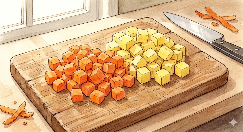 감자와 당근은 고기 크기에 맞춰 깍둑썰기를 해줍니다. 너무 크게 썰면 익는 데 시간이 오래 걸리고, 너무 작으면 끓이다가 뭉개질 수 있으니 적당한 크기가 중요해요.