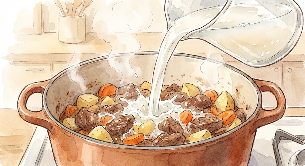이제 물을 부을 차례인데요. 여기서 잠깐! 맹물 대신 쌀뜨물이나 치킨 스톡을 활용한 육수를 사용해 보세요. 국물 맛이 훨씬 진하고 구수해집니다.