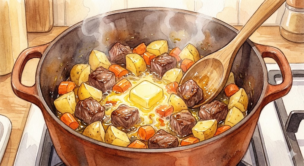 고기가 어느 정도 익으면 손질한 감자와 당근을 넣고 함께 볶아줍니다. 채소 겉면에 기름 코팅이 되면 끓일 때 잘 부서지지 않고, 고소한 맛도 배어듭니다. 이때 버터 한 조각을 넣어주면 풍미가 훨씬 고급스러워져요.