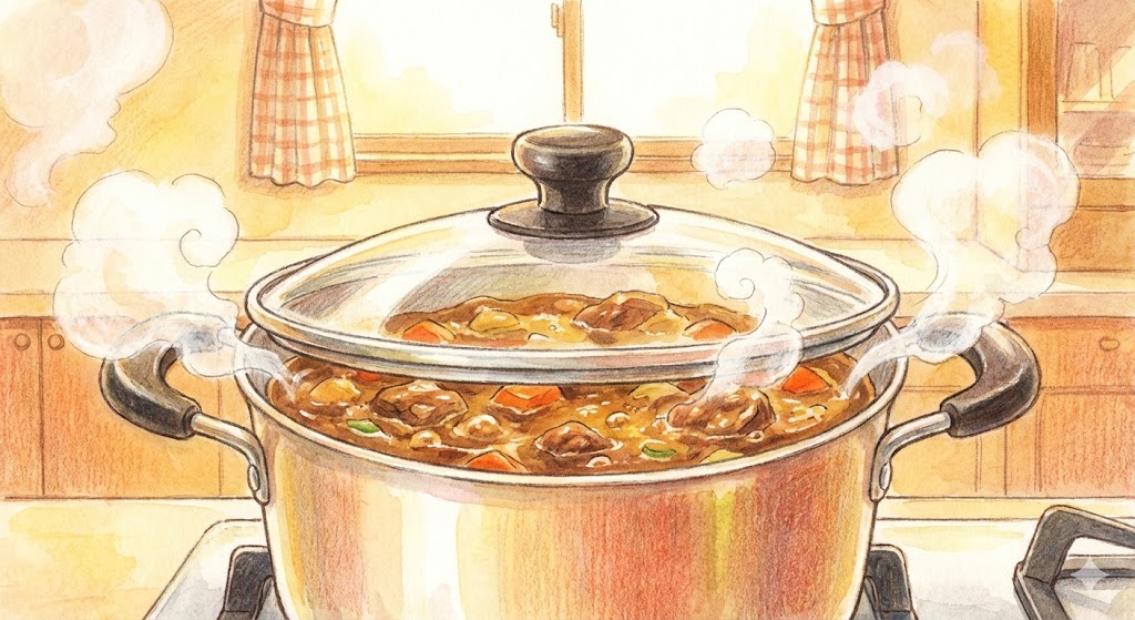 모든 재료가 어우러졌다면 약불에서 은근하게 끓여주세요. 그리고 불을 끄고 잠시 뜸을 들이는 시간이 필요합니다. 카레는 끓인 직후보다, 한 김 식히거나 다음 날 먹었을 때 재료에 간이 배어 훨씬 맛있다는 사실, 알고 계시죠?