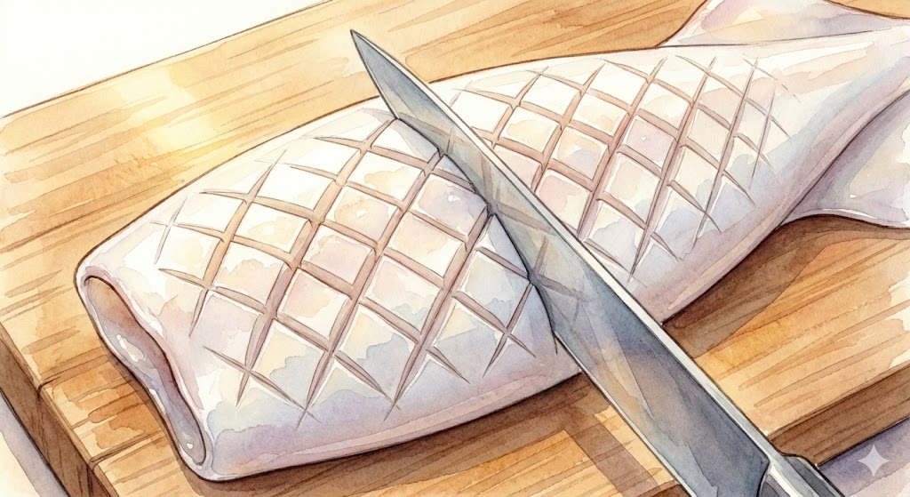오징어 안쪽에 '파채 칼'이나 식칼을 눕혀서 사선으로 칼집을 내주세요. 이렇게 하면 모양도 예쁘지만, 양념이 사이사이 깊게 배어들어 훨씬 깊은 맛을 낼 수 있어요. 채소는 양파, 당근, 대파, 양배추, 청양고추 등을 준비해 주세요. 특히 양배추는 자연스러운 단맛을 내주니 꼭 넣으시는 걸 추천드려요!