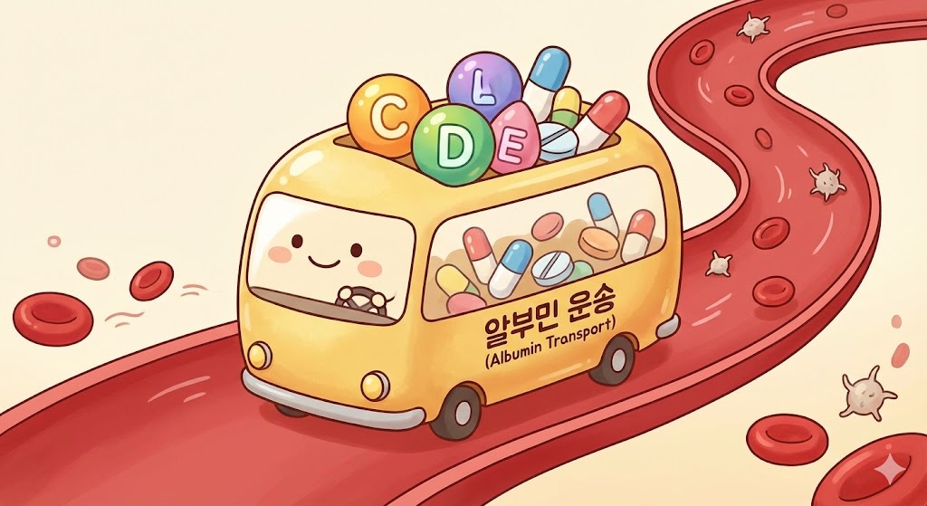 알부민을 '몸속의 버스'라고 표현한 이유가 여기에 있습니다. 알부민은 혼자 돌아다니지 않고 우리 몸에 꼭 필요한 호르몬, 비타민, 미네랄, 효소, 그리고 복용하는 약물까지 등에 업고 필요한 장기로 배달해 줍니다.