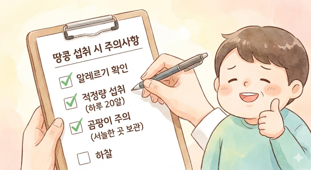 아무리 좋은 음식도 과하면 독이 될 수 있겠죠? 땅콩은 고지방 식품이라 과다 섭취 시 설사를 유발하거나 체중이 증가할 수 있습니다. 하루 20~30알 정도가 딱 적당해요. 특히, 땅콩 알레르기가 있는 분들은 섭취를 피해야 하며, 보관할 때는 서늘하고 건조한 곳에 두어야 합니다. 잘못 보관하여 곰팡이가 핀 땅콩은 '아플라톡신'이라는 독소가 생길 수 있으니 절대 드시면 안 돼요!