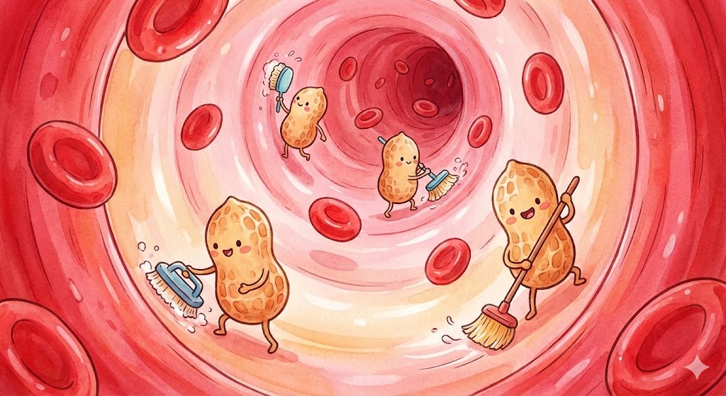 땅콩의 가장 대표적인 효능은 바로 혈관 건강입니다. 땅콩에는 불포화지방산인 '올레인산'과 '리놀렌산'이 풍부하게 들어있어요. 많은 분이 지방이라고 하면 걱정부터 하시지만, 이 '착한 지방'은 혈관 속에 쌓인 나쁜 콜레스테롤(LDL)을 청소하고 배출해 주는 역할을 한답니다.
