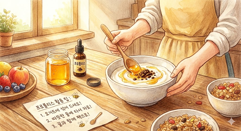 쓰던 로션에 한두 방울 섞어 바르면 훌륭한 고보습 크림으로 변신하기도 하죠. 평소 즐겨 먹는 요거트나 샐러드에 뿌려 먹으면 특유의 향에 대한 거부감 없이 맛있게 즐길 수 있습니다. 이렇게 일상 곳곳에서 프로폴리스를 활용해 보세요. 건강 챙기기가 한결 쉽고 즐거워질 거예요.
