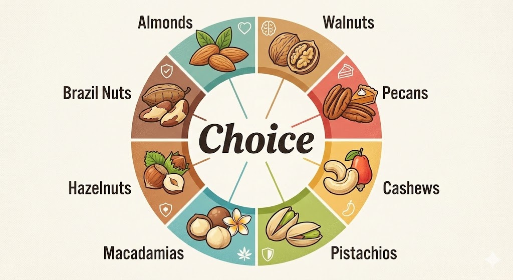 핵심 정리 견과류는 종류마다 효능이 다릅니다. 아몬드는 다이어트, 호두는 뇌 건강, 캐슈넛은 빈혈 예방, 피스타치오는 눈 건강, 브라질너트는 면역력(하루 2알 제한), 마카다미아는 혈관 건강, 피칸은 항산화에 좋습니다. 자신의 건강 상태에 맞춰 적당량을 밀폐 보관하여 꾸준히 섭취하는 것이 중요합니다.