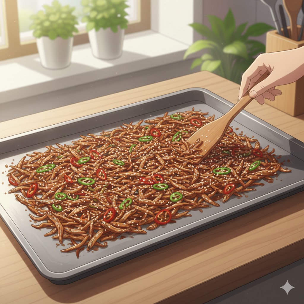 넓은 쟁반이나 접시에 멸치볶음을 얇게 펴서 완전히 식혀주세요. 이렇게 식히는 과정에서 수분은 더 날아가고, 설탕과 올리고당 코팅이 바삭하게 굳으면서 '과자 같은 식감'이 완성됩니다.