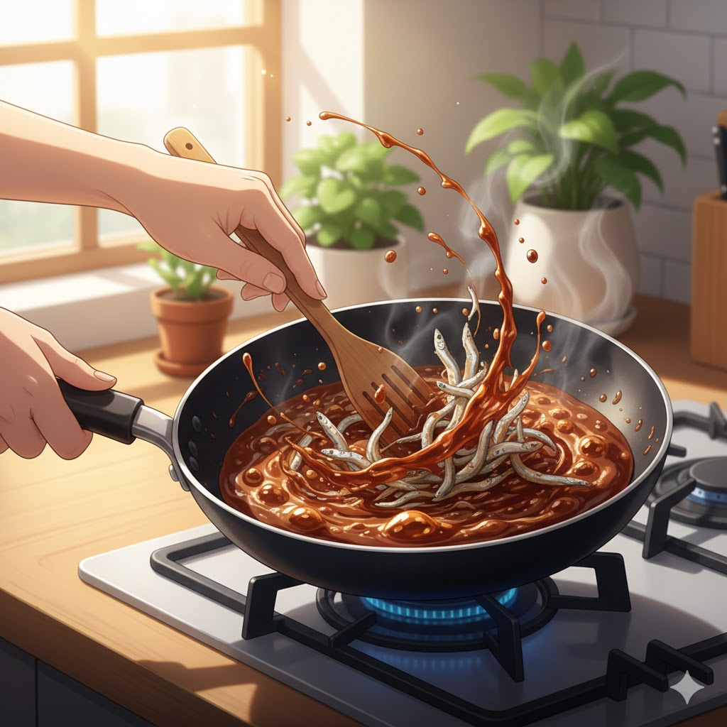 잘 볶아진 멸치는 다시 덜어내고, 팬에 양념장(진간장 1스푼, 맛술 2스푼, 설탕 0.5스푼)을 넣어주세요. 여기서 중요한 건 불을 끄거나 아주 약하게 줄인 상태여야 한다는 점입니다. 양념이 부글부글 끓어오를 때 불을 끄고 멸치를 넣어 잔열로 버무려주세요.
