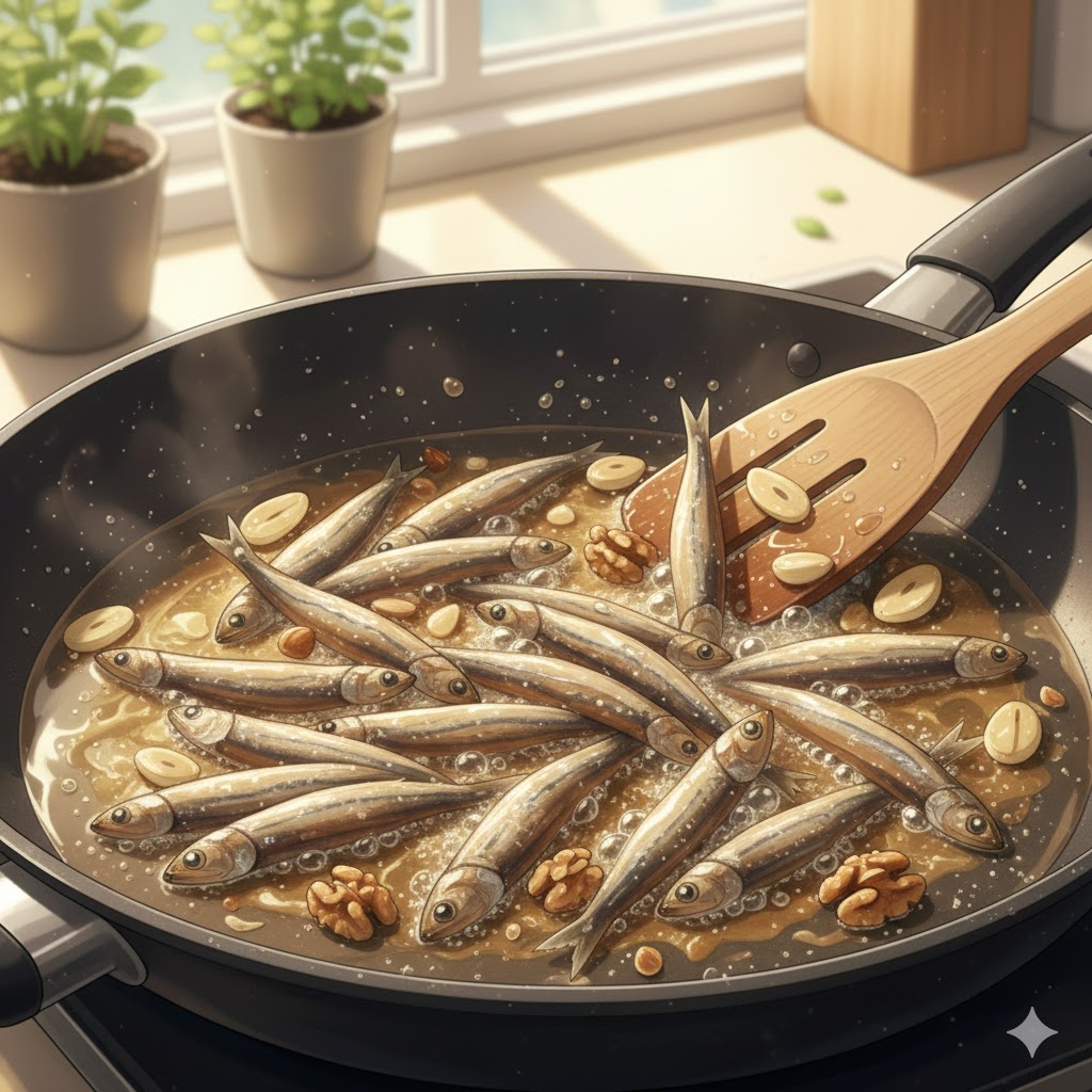 멸치볶음 실패의 원인 1순위는 바로 '양념 타이밍'입니다. 멸치와 양념을 처음부터 같이 넣고 끓이면 멸치가 양념을 다 흡수해서 짜고 눅눅해져요.
