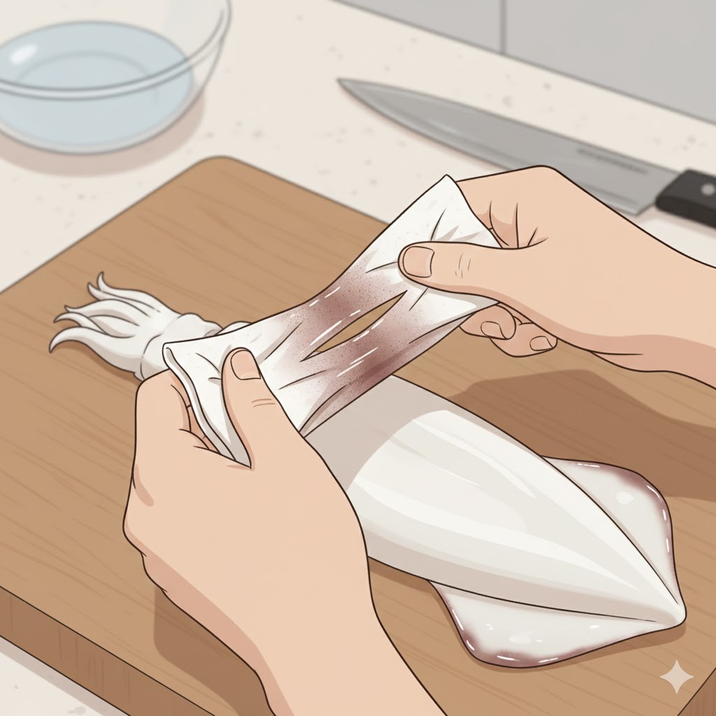 오징어는 내장을 제거하고 흐르는 물에 깨끗이 씻어주세요. 여기서 중요한 팁! 오징어 껍질에는 타우린이 많지만, 식감을 부드럽게 하고 양념이 잘 배게 하려면 껍질을 벗기는 것이 좋습니다. 키친타월을 이용해서 끝부분을 잡고 당기면 미끄러지지 않고 쉽게 벗겨낼 수 있어요.